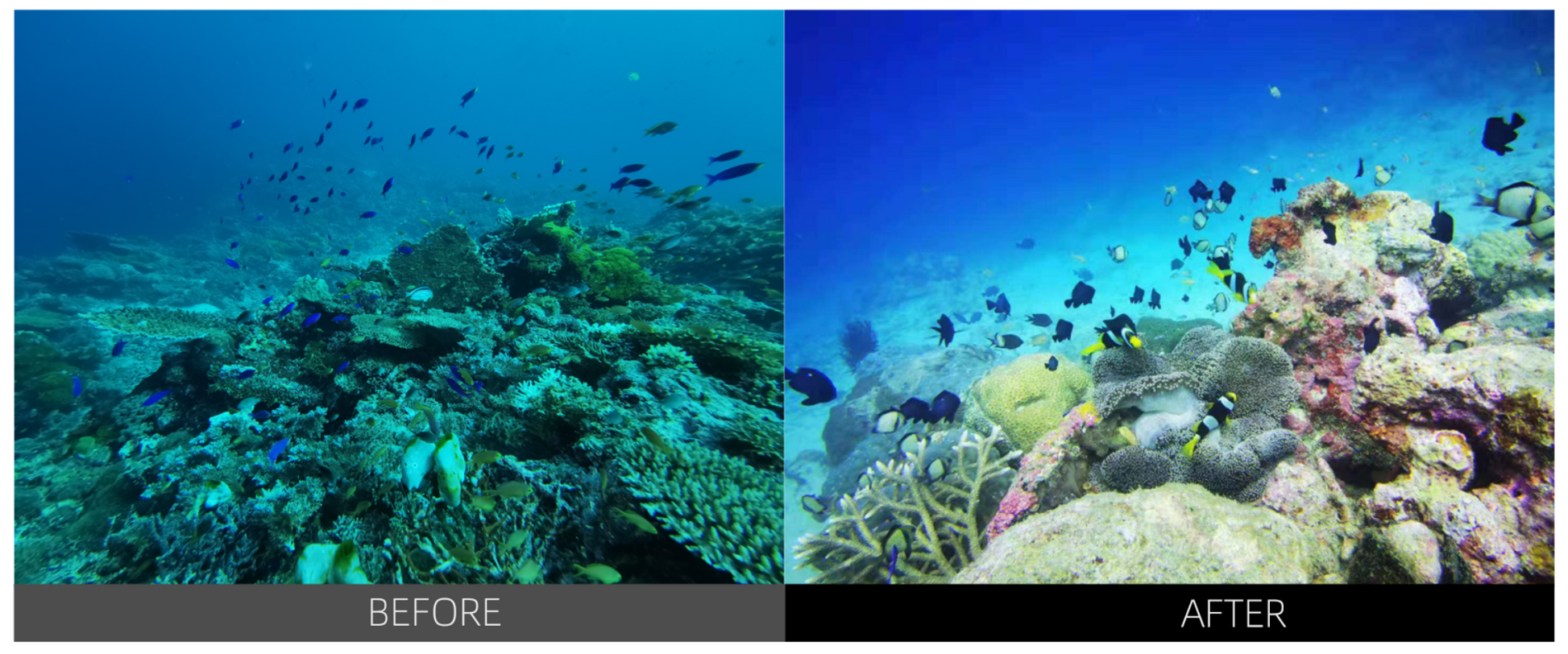 太陽光が水中に入ると、暖かみのある波長が減衰し、青や緑が強調されるため、赤やオレンジ、黄色など色彩が失われた写真が撮影されることがあります。しかし、カラーフィルターを使用すれば、水中でも色の再現性をある程度回復することができます。